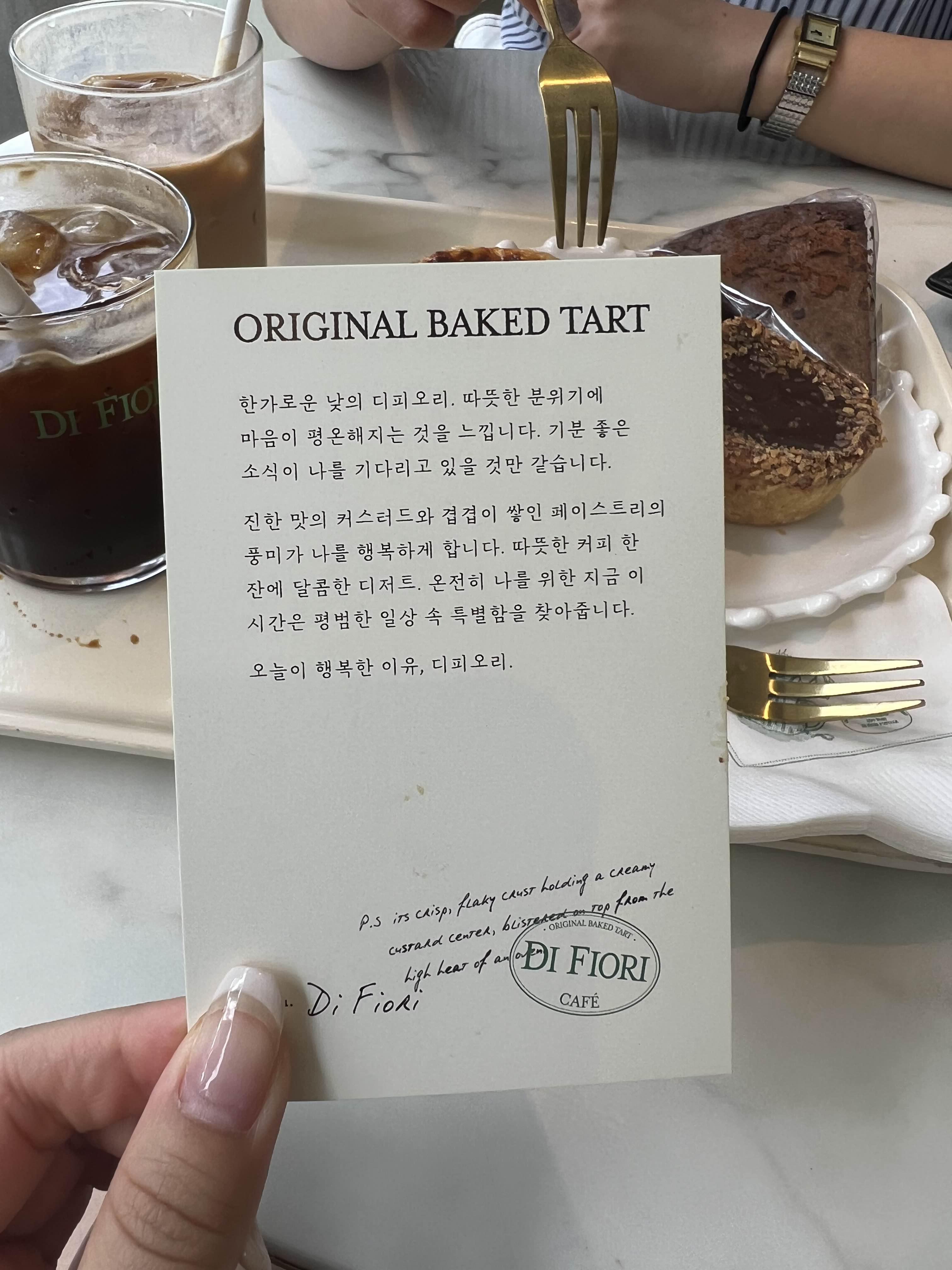 단순 디저트랑 커피만 파는 게 아니라 브랜딩에도 신경 쓰시는 것 같은 디피오리 용산!! "진한 맛의 커스터드와 겹겹이 쌓인 페이스트리의 풍미"라는 문장을 읽기만 해도 심장이 두근두근... 넘 평화롭고 행복해지는 글귀!!